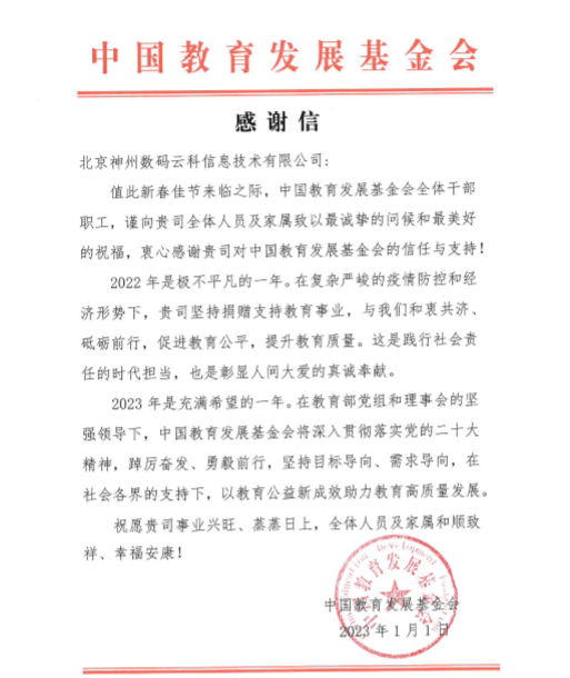 近期,K8凯发一触即发瓦力游戏官网收到中国教育开展基金会的感谢信,以感谢K8凯发一触即发瓦力游戏官网2022年在职业教育领域的贡献和实践,尤其是在全国职业院校大赛(中高职组)中对大赛顺利召开所付出的努力。